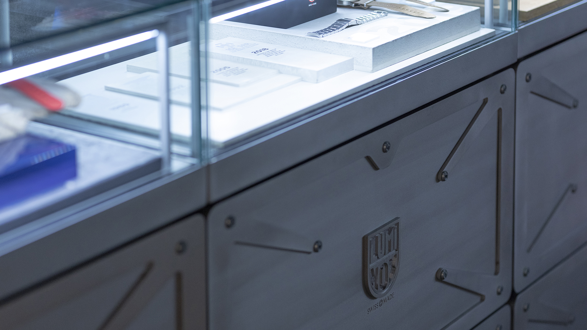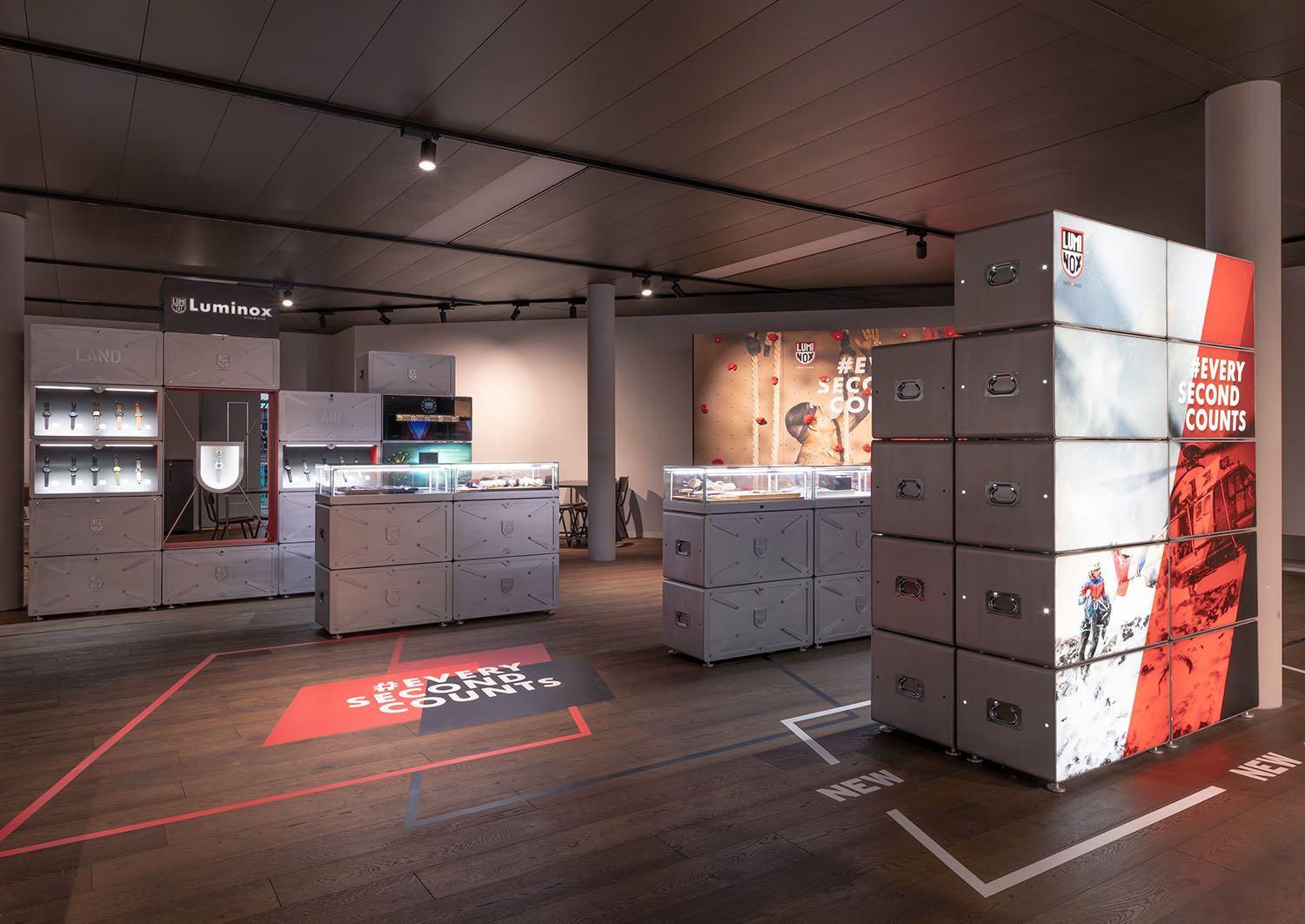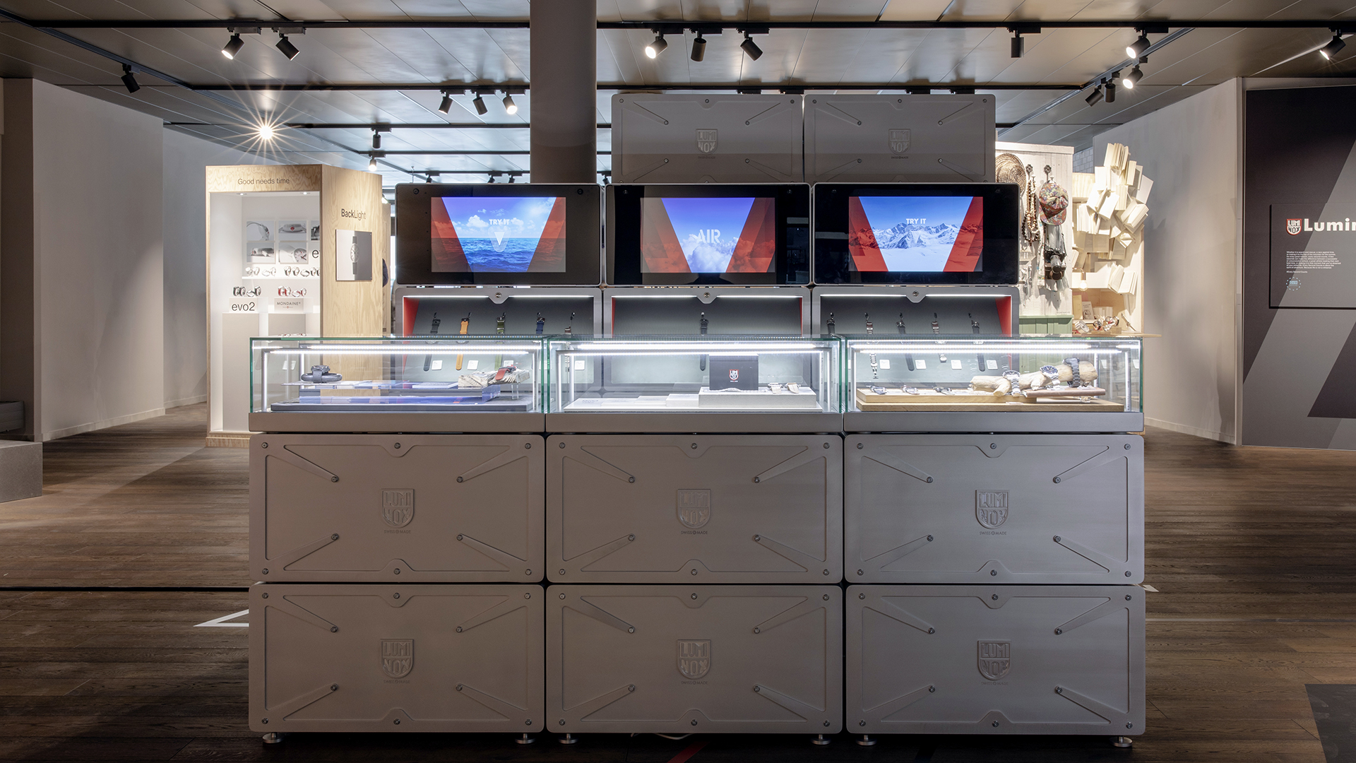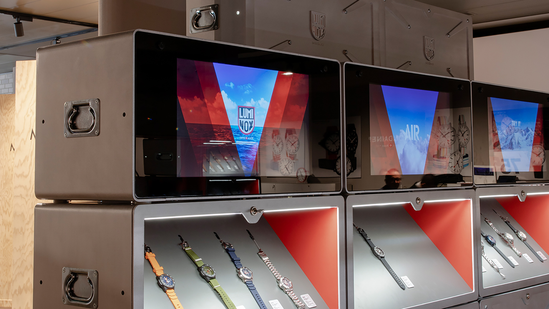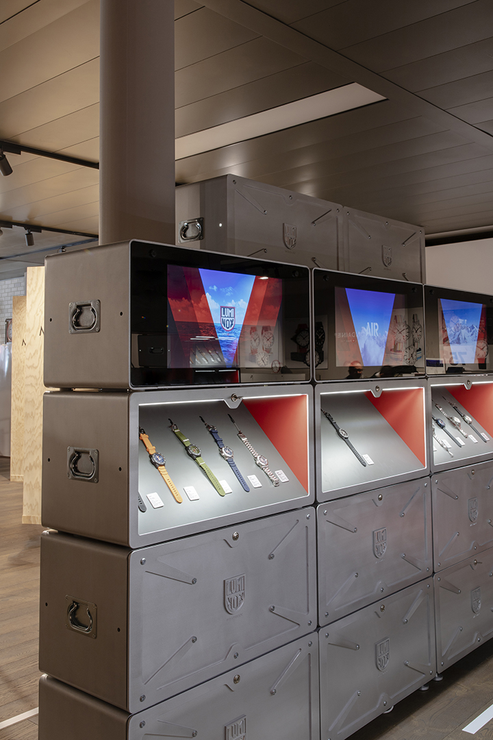 Die modulare Boxenarchitektur, speziell für die Uhrenmarke Luminox entwickelt, bietet maximale Flexibilität und ermöglicht verschiedene Set-ups, die perfekt an unterschiedlichste Anforderungen angepasst werden können. Herzstück des Designs ist das integrierte „Lift & Learn“-Feature, das den Kunden die Möglichkeit gibt, durch Anheben der Uhren digitale Produktinformationen abzurufen und in die faszinierende Markenwelt einzutauchen. Dieser Ansatz schafft eine harmonische Verbindung zwischen innovativer Technologie und der authentischen Geschichte der Marke, wodurch ein außergewöhnliches Kundenerlebnis entsteht.